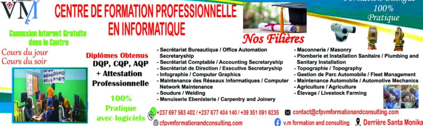 Siège social ; Entrée Simbock-Mendon Derrière Santa Monica. Yaoundé P.O.BOX 15009, Cameroun. Mail ; contact@cfpvmformationandconsulting.com