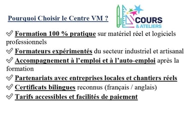 À travers des ateliers modernes, des formateurs qualifiés et des programmes bilingues, le Centre VM s’engage à offrir un enseignement concret, humain et tourné vers l’emploi.